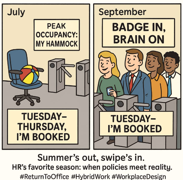 After the summer lull, September reliably brings a “snap-back” in office attendance as schools resume and annual leave winds down. Booking/occupancy platforms show a July dip and a rebound across August–September—so HR teams should expect tighter desk utilization, fuller mid-week peaks, and a fresh wave of policy-compliance conversations.